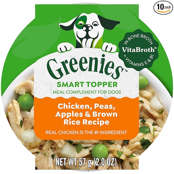 - Contains ten (10) 2.0 oz trays of Greenies Smart Topper High Protein Wet Mix-In for Dogs, Chicken, Peas, Apples & Brown Rice Recipe In Vitabroth Broth - Bone Broth + Vitamins E & B1.