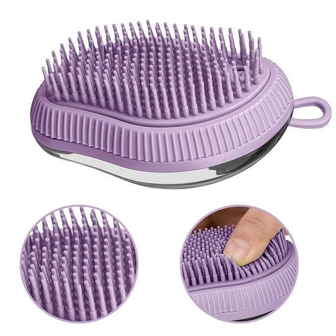 Pet Grooming Bath Massage Brush with Soap and Shampoo Dispenser Soft Silicone Bristle for Long Short Haired Dogs Cats (PURPLE)
