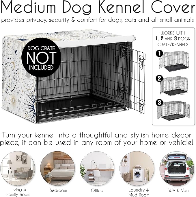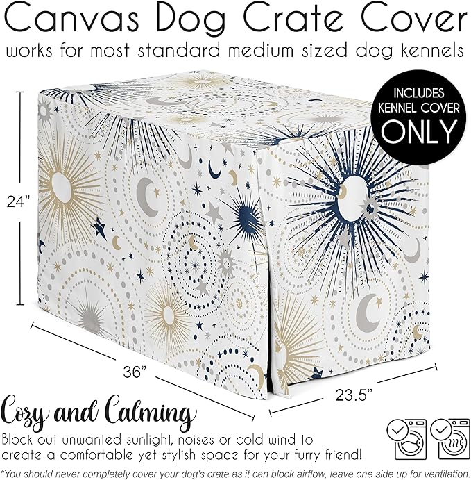 Sweet Jojo Designs Navy Blue Star and Moon Dog Crate Cover – Kennel Covers for 36 Inch Pet Cage Medium - Gold Grey Celestial Sky Stars Gray Shabby Chic
