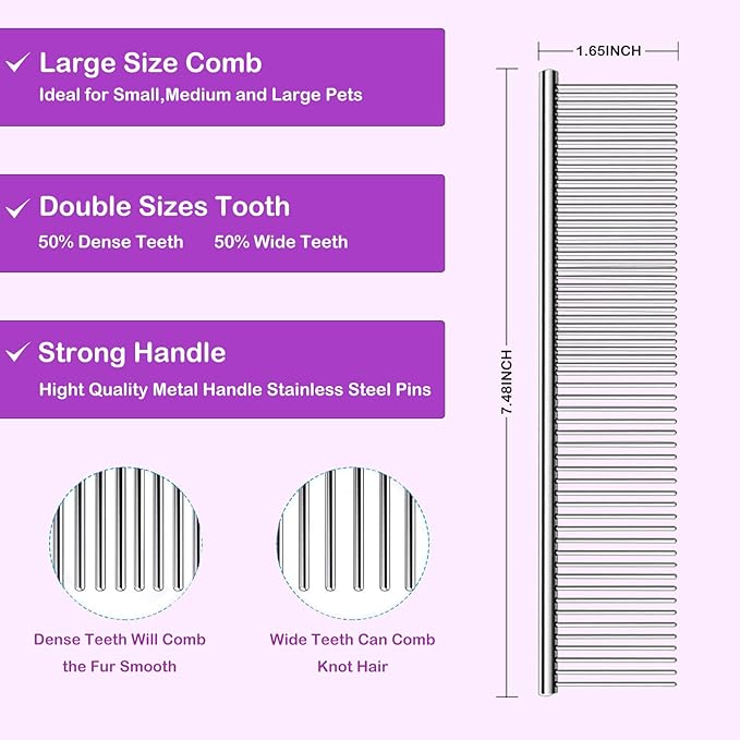 - STAINLESS STEEL COMB 2-IN-1 DESIGN - Sparse teeth to loosen tangled hair & comb large fluffy hair, also can be styled for dogs; dense teeth to comb eyes ears, nose & fine hair on legs; rounded pins with smooth stainless steel to effectively prevent static electricity & tangled hair when combing.