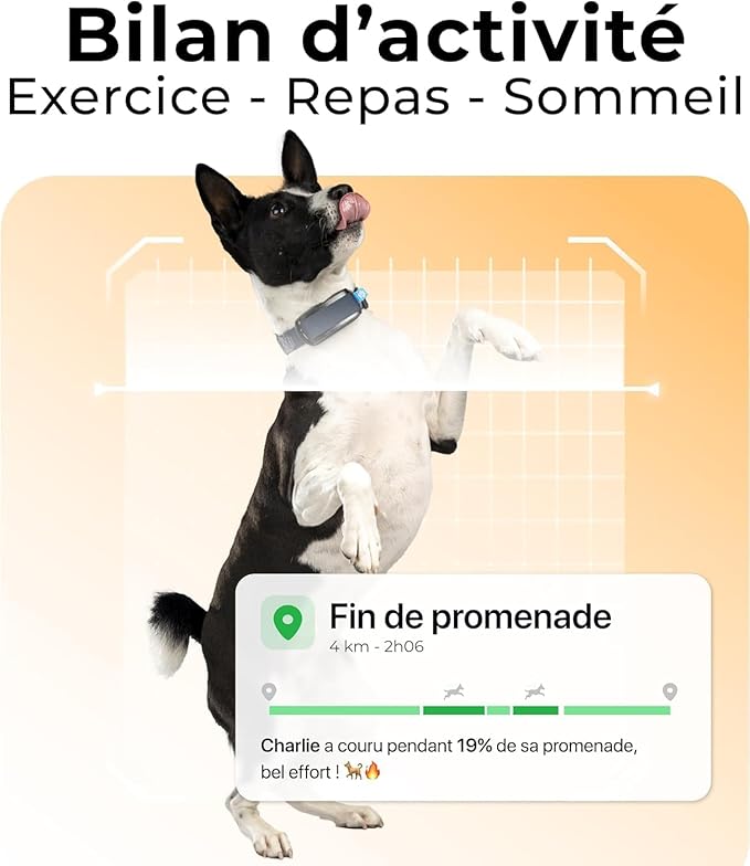 - ACTIVITY MONITORING: Ensure that its level of activity and exercise matches its needs (walking, playing, running), track its meals, and monitor the quality of its sleep.