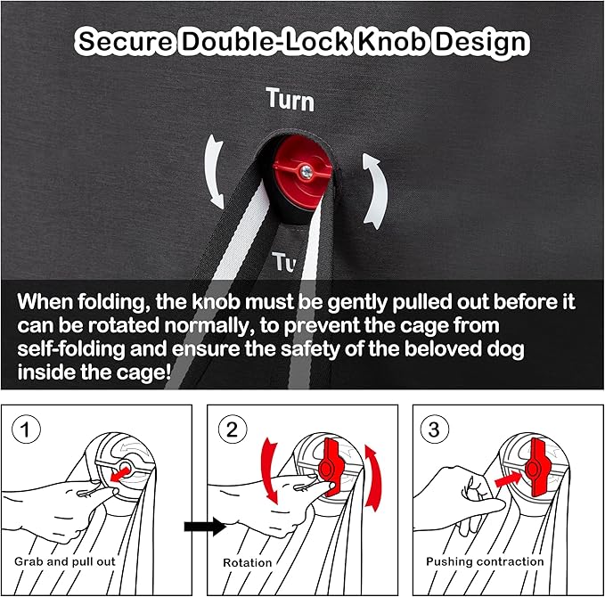 - Safety knob & Zipper & Leash: To ensure the safety of your beloved dog inside the crate, our knob is designed with a two-step locking mode. When folding, you need to gently pull it out before you can rotate it normally, to prevent the crate from suddenly folding. The safety leash inside our dog crate clips onto your dog's collar to ensure they stay safely inside it. It also comes with a heavy-duty self-buckling zipper for added security.