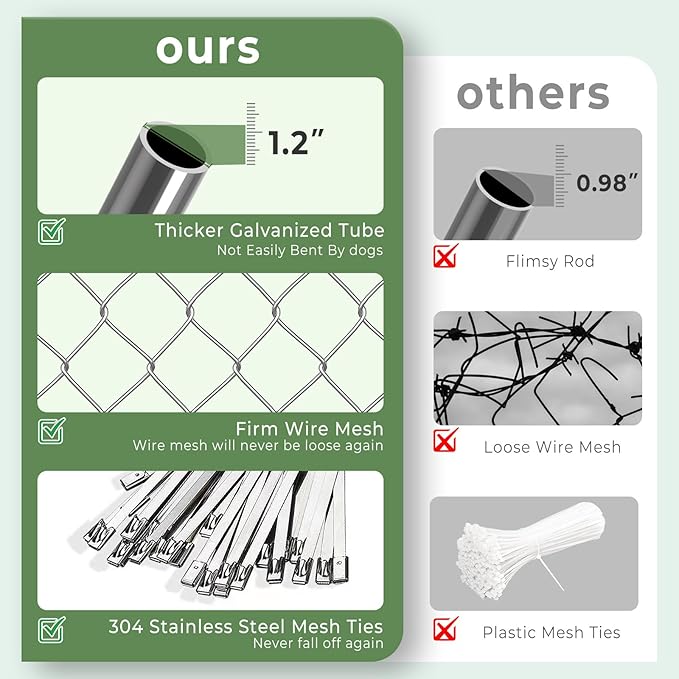 - 【4 Effective Upgrades】outdoor dog kennel has upgraded the edge of iron mesh, metal ties, 2.5mm thick iron wire mesh, and the safe lock; The edges of the mesh are wrapped together in a more sturdy structure to effectively prevent the mesh from loosening