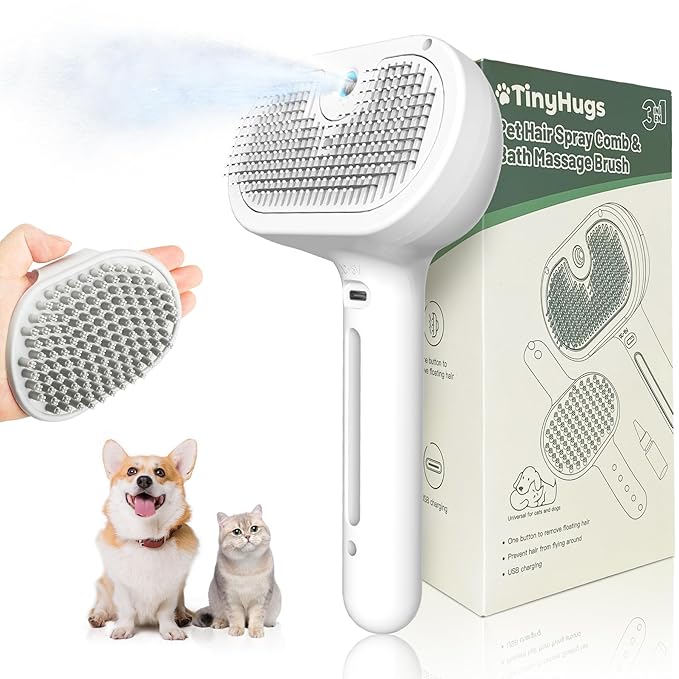 Tiny Hugs 4-in-1 Grooming Tool: Self-Cleaning Brush for Detangling Pet Fur, Steam Feature, and Bath Supplies