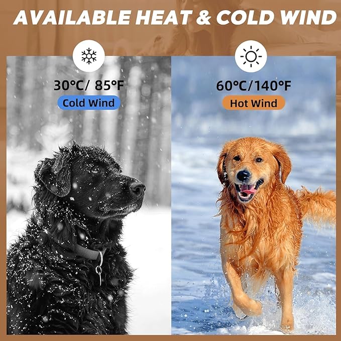 - 【Powerful Blow Force & Stepless Adjustable Speed】Professional pet hair dryer is powerful and stable. Voltage: 220V~. Stepless Adjustable Speed: You can choose different wind level with your pet size. Give your lovely pet a thorough dry after shower. Wind speed range: 25m/s-82m/s; temperature range: 70°F - 150°F. Let your dog say goodbye to wetness and discomfort!