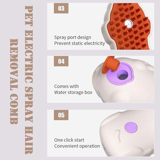 - Three-in-one design: Hair removal, spray cleaning and massaging. which can comb tangleds hair, spray clean pet hair, and massage pets to make them more comfortable and reduce shedding.