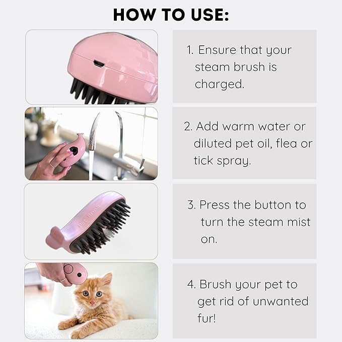 - 💧 Easy to use - Simply fill with water or dilute with pet oil or bug sprays, and turn on to allow a mist. USB cord included to recharge the steamy cat brush. Battery time lasts about 1 week.