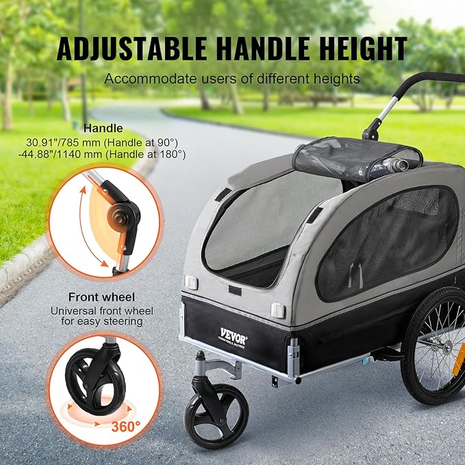 - Adjustable Handle Height: The handle of our pet bike carrier is height-adjustable, ranging from 30.91"/785 mm (at a 90° angle) to 44.88"/1140 mm (at a 180° angle). It's designed to accommodate individuals of varying heights. Whether you're a tall rider or on the shorter side, we've got you covered.