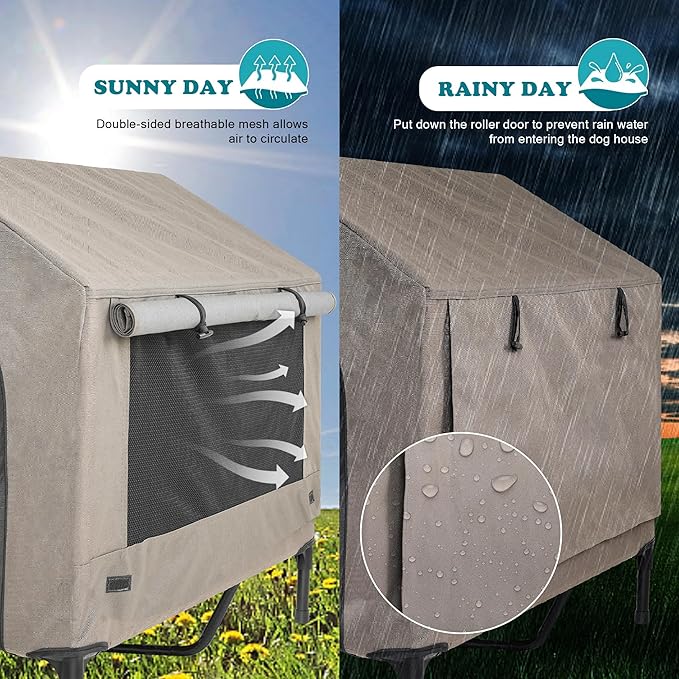 - 【INDOOR & OUTDOOR USE】A-frame canopy roof.There are 2 Air Vents on the pet outdoor shelter. In sunny days, curtains can be rolled up to enhance air circulation.In windy days, the curtains can be rolled down and fixed with velcros.Tips: The roof is not protected from water.In rainy days, we suggest that you move the pet bed into the house so that your furry friend won't get wet.