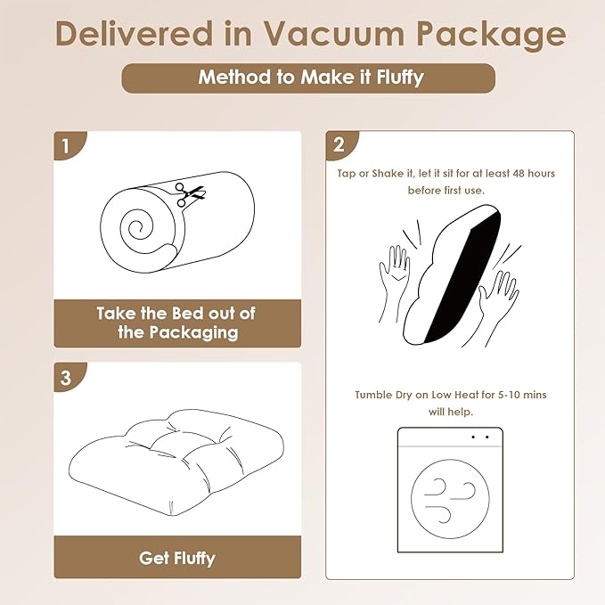 - MACHINE WASH and CARE INSTRUCTION - The washable dog bed can be put directly into the washing machine as a whole. This plush dog bed is vacuum-compressed, please remove the compression bag, shake it completely, and leave it for about 24 hours to expand. After washing and before use, please shake the bed back fluffy.