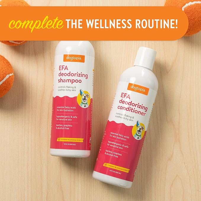 - With its gentle formulation and incredible cherry blossom scent, Dogtopia’s EFA Deodorizing will keep your pet clean, comfortable, and smelling fresh.