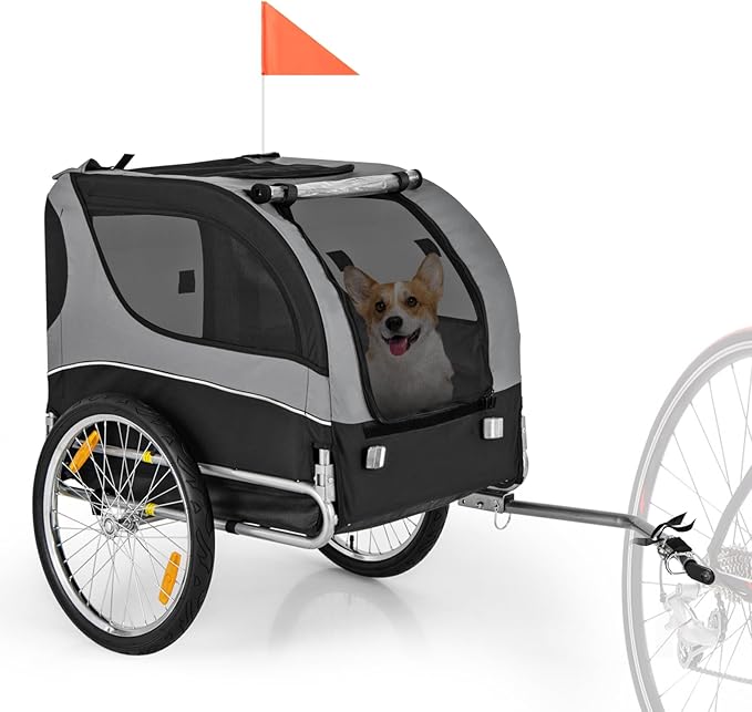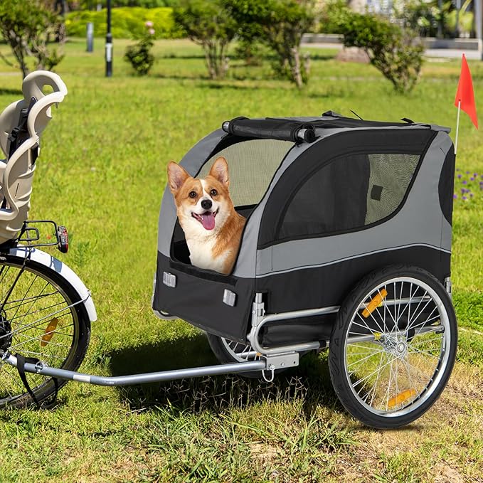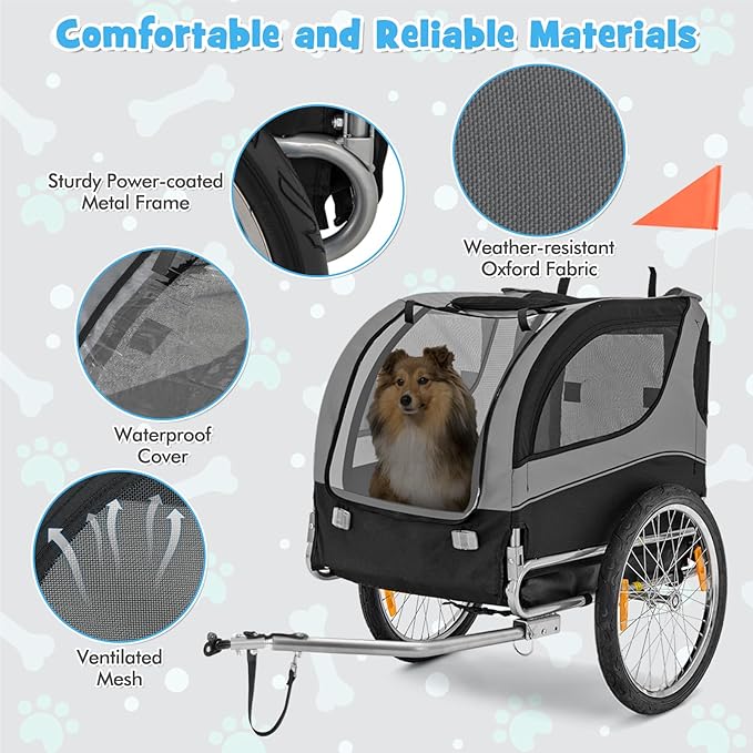 - Superior Safety Guarantee: The pet trailer is equipped with 8 reflector lights and 1 red safety flag. The bright colors will provide warning to surrounding vehicles and pedestrians, and improve safety when driving in low light conditions. In addition, there are D-rings inside the pet trailer that can be used to attach a safety rope to prevent your pet from falling.