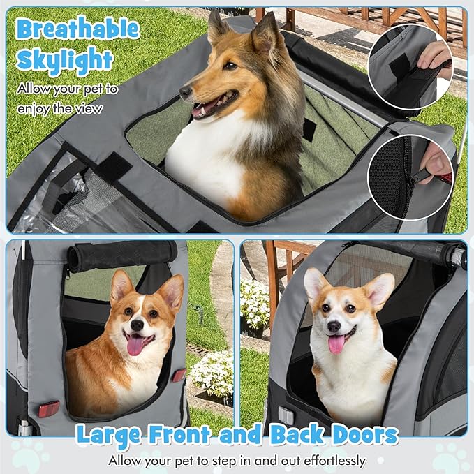 - Good Ventilation & Easy Access: The pet trailer has zippered mesh doors at the front, back and top. All doors can be rolled up with convenient hook and loop fasteners, easy access for your pet. Transparent front door and side mesh design allows pets to enjoy beautiful scenery along the way.