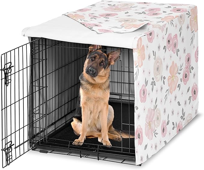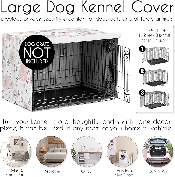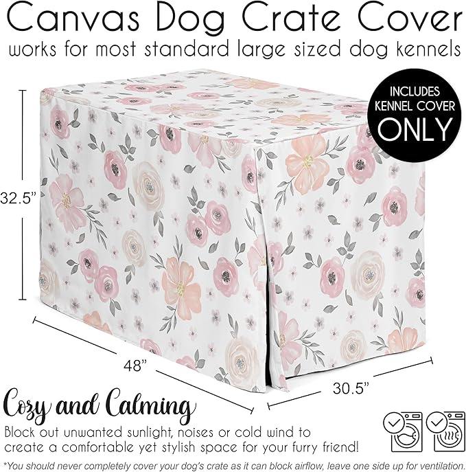Sweet Jojo Designs Blush Pink Grey Boho Floral Dog Crate Cover – Kennel Covers for 48 Inch Pet Cage Large - Bohemian Farmhouse Shabby Chic Rose Lily Watercolor Flower Elegant Gray and White