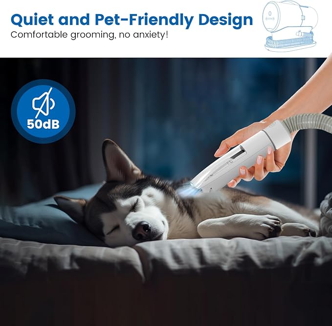 - Low Noise Design: Pet grooming vacuum for dogs operates at less than 60 decibels, ensuring a quiet environment that won't startle or distress your furry friend. With three adjustable suction levels to choose from, you can customize the grooming experience according to your pet's needs. The adjustable suction levels allow you to find the perfect balance between effective hair removal and your pet's comfort.