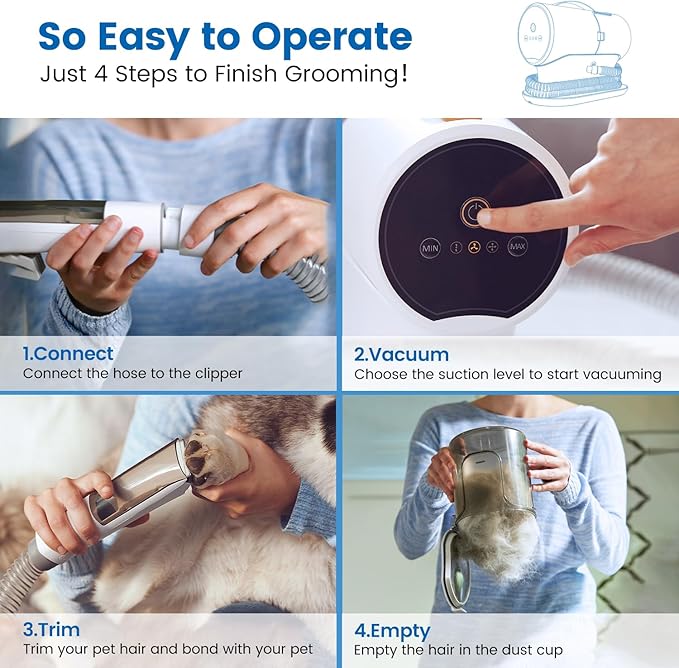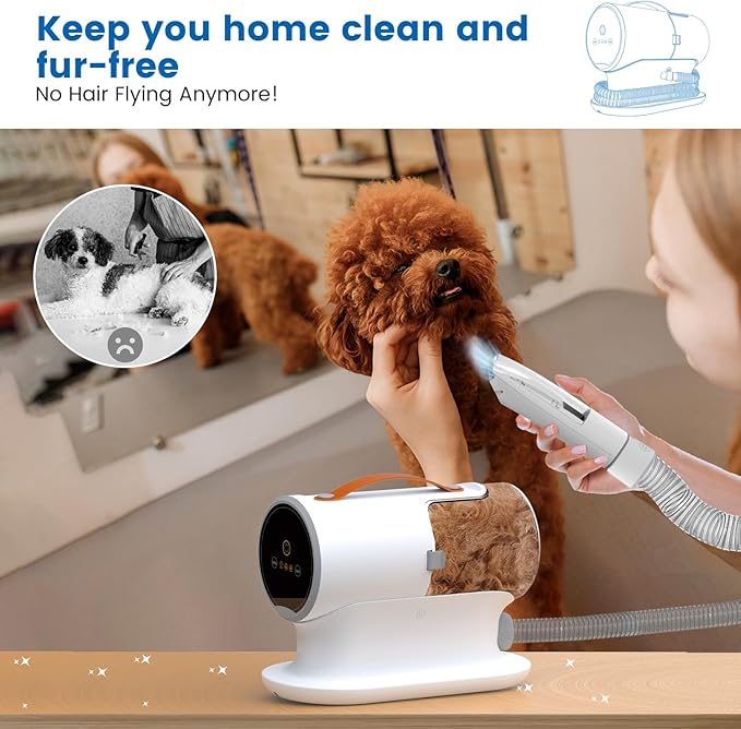 - Simultaneous Grooming and Vacuuming: Our dog grooming vacuum are equipped with a vacuum function, capable of collecting up to 99% of pet hair into a vacuum container. While grooming your pet's hair, the loose hairs that are removed are directly sucked into the vacuum dust box. Whether you are a novice or an experienced pet owner, these clippers make home grooming an effortless task.