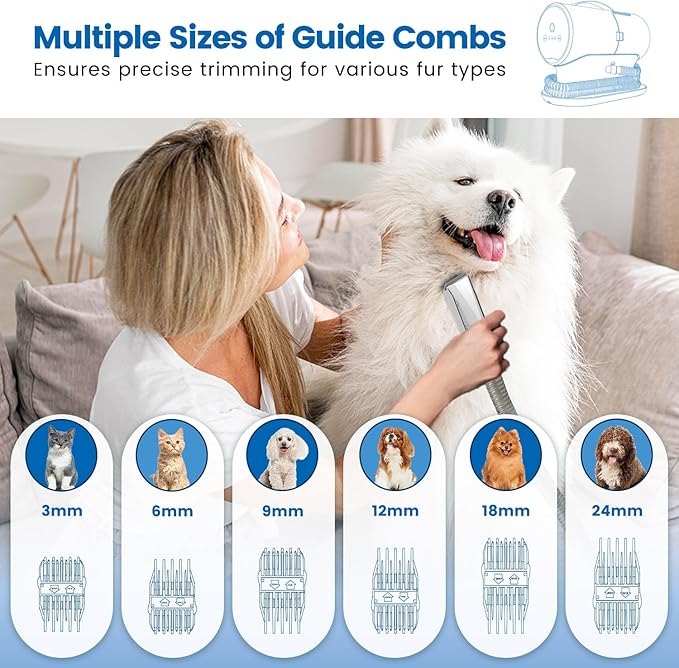 - Multiple Guide Combs: Our pet grooming kit has six guide combs in different sizes—3mm, 6mm, 9mm, 12mm, 18mm, and 24mm. These combs are perfect for trimming pet hair of various lengths. No matter the length of your pet's fur, you can get a great look with these. Whether short, medium, or long hair, there's a comb for every need. With this variety, you can style your furry friend just the way you want.