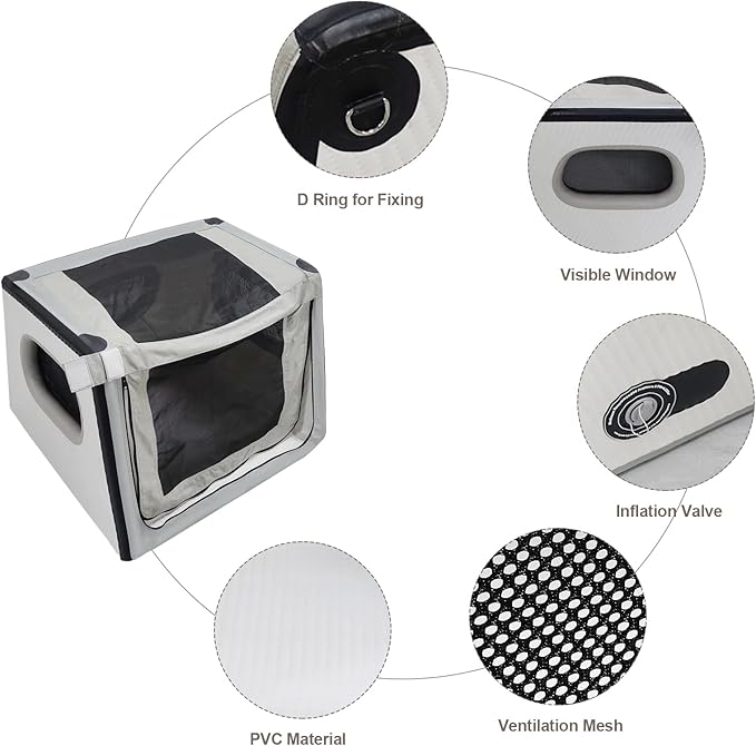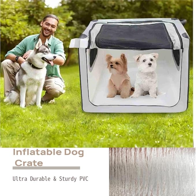 - Durable and Safety : The inflatable dog crate is made with military-grade, puncture-resistant, waterproof, and military-tested PVC materials. With the durability and safety of hard-sided kennels and the convenience of lightweight soft-sided dog kennels, it offers an "airbag function" to maximize impact safety for dogs during travel in case of emergency braking or sudden evasive movement.