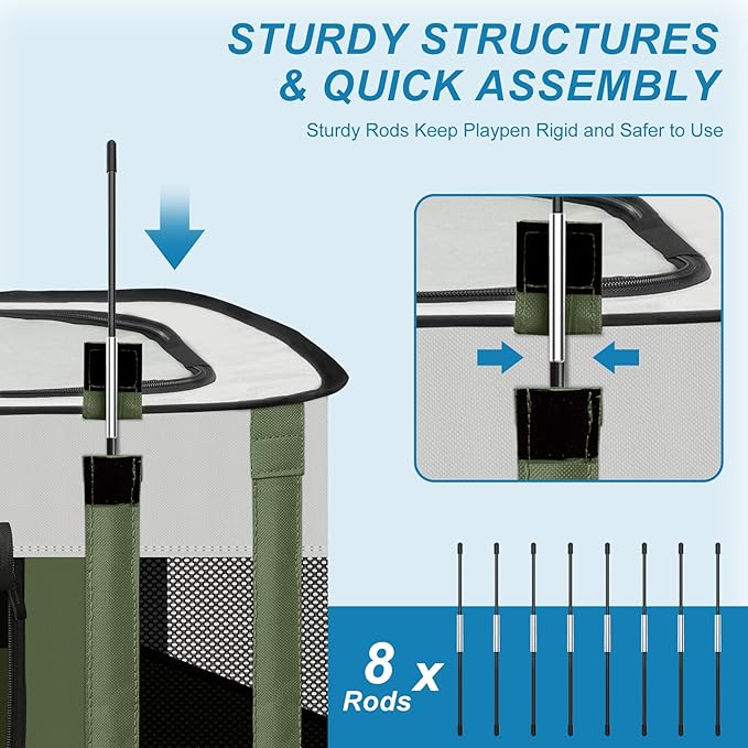 - 【No Assembly required】Opening the dog pen takes only a few seconds, is lightweight, strong, and does not require assembly. When not in use, it can be folded into the tote bag provided by us, which takes up minimal space and is easy to carry and store. Spacious interior Spaces allow your pet to play, sleep, hide or isolate. Perfect for indoors, lawns, beaches, parks, Tours, camping and more!