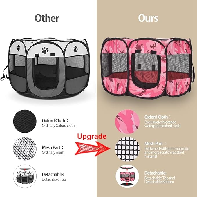- Upgraded and Optimised: Compared with the old version, our new dog playpens have been upgraded and optimised in many ways. The thickened Oxford and PVC plastic mesh enhances its waterproof, mosquito, scratch and warmth protection of the dog play pen, and adds a removable bottom for easy cleaning.