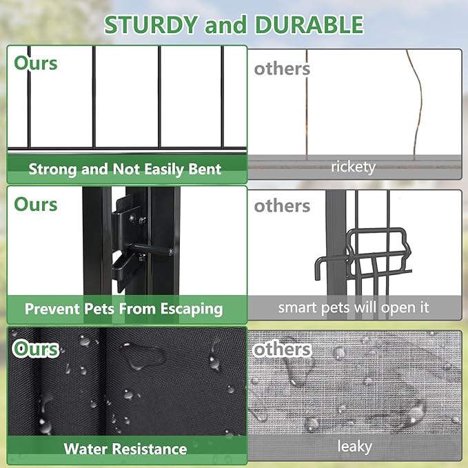 - 【Sturdy & Stable】Our 4x4 dog kennel is made of sturdy construction and the black E-coating surface, ensures durability and keeps dogs safe from tearing up your home, lasts through heat, cold, rain and extreme winds. The upgraded ground nails greatly improve the stability of dog kennel, prevent dog from knocking over and escaping