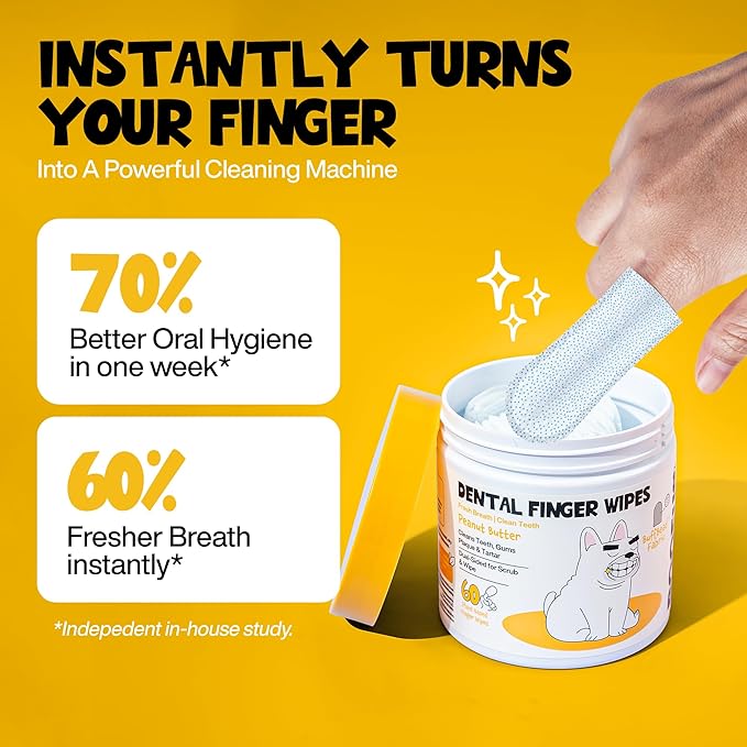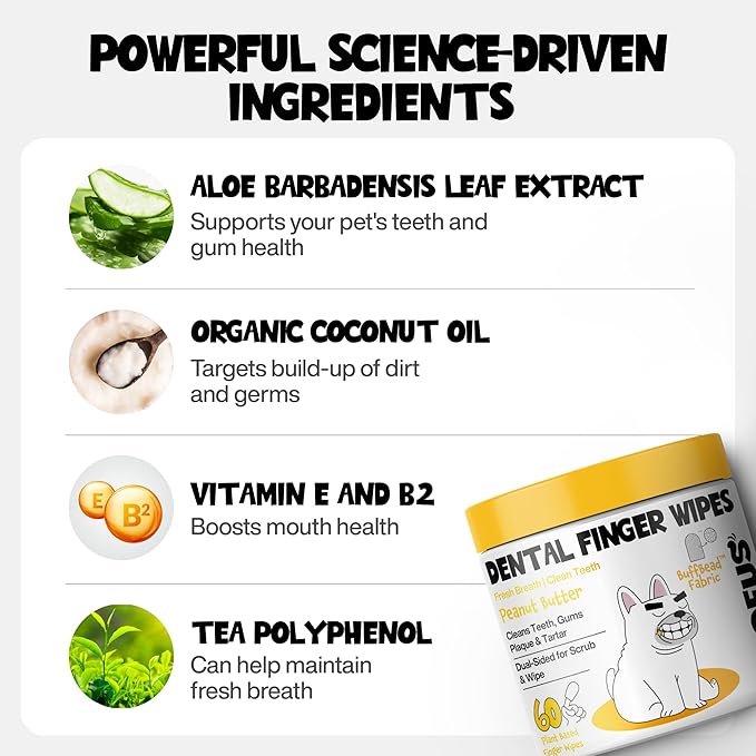Teeth Cleaning Wipes 60 Packs - Peanut Butter Dental Wipes to Reduce Plaque & Tartar for Dogs & Cats - Pet Dental Wipes for Oral Freshness