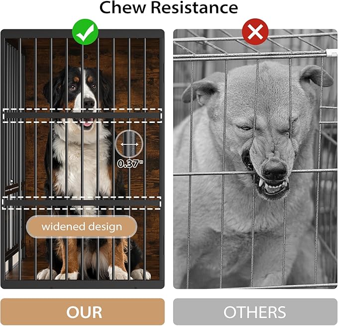 - [ Sturdy Build for Longevity ] This indestructible dog crate is made of thickened iron tubes instead of fragile wires to avoid crate damage caused by dog chewing. There are also two metal tubes at the bottom of the dog crate, and the whole structure can support up to 160lbs. Ideal for your dog's daily activities.
