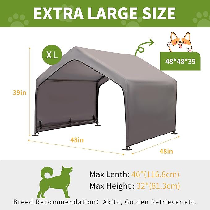 Extra Large Dog House Outside, Dog Tent Outdoor, Big Dog Shade Shelter Doghouse Canopy, Water Resistant Dog shelter with Ground Nail, Gray Sun Rain Cover for Pet Cat Livestock 4'x 4'x 3.3