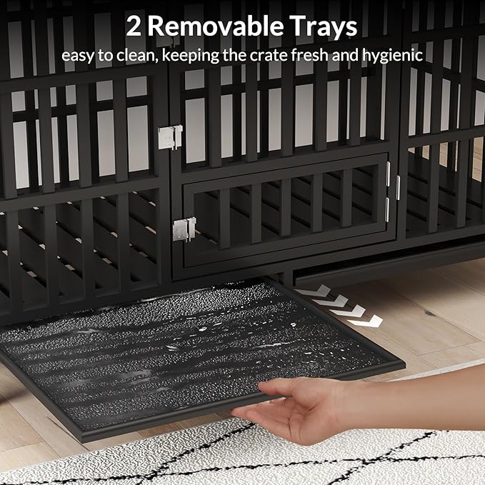 - Easy Maintenance & Maneuverability: The escape proof dog crate comes with two removable plastic trays for simple cleaning, making it easy to maintain. Four lockable 360-degree wheels enable smooth mobility, so you can effortlessly move it from room to room and keep it securely in place.