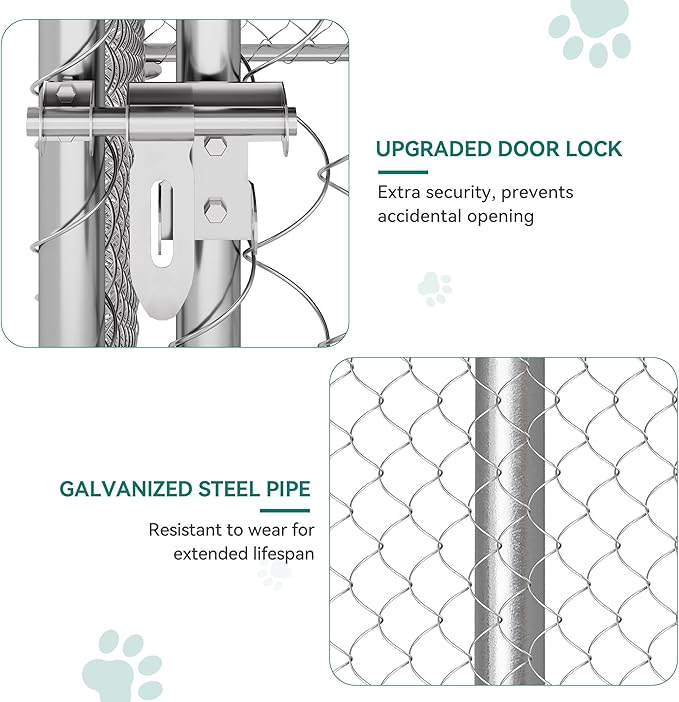 - Unmatched Durability: Built from heavy-duty galvanized steel, our dog kennel offers a safe haven for your playful pup; Anchored with ground stakes for rock-solid stability, it features an upgraded lock to keep them secure, ideal for carefree outdoor fun