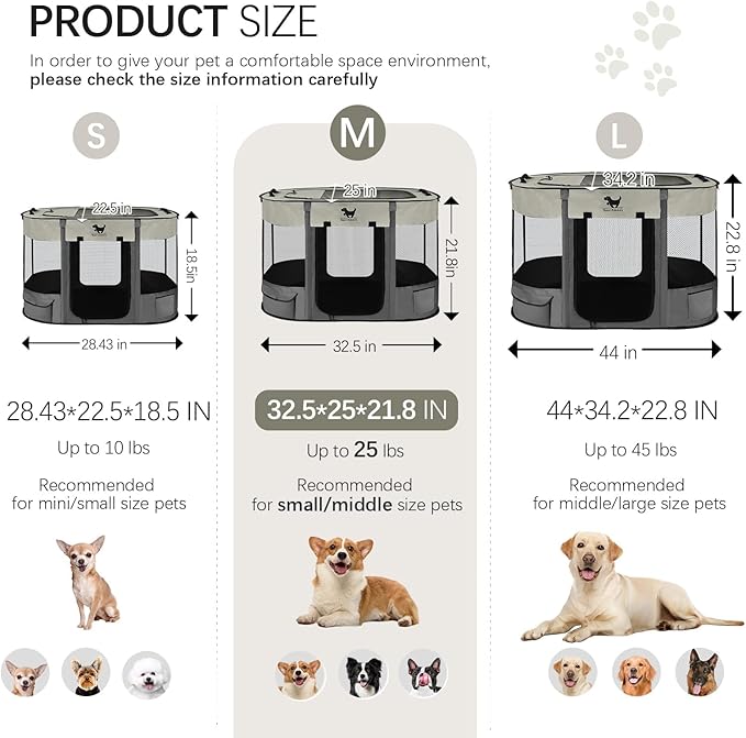- Breathable & Safe Outdoor Design: The puppy playpen has 360°thick mesh and a removable top to provide good ventilation for pets. The dog cage medium sized dog enclosure has two doors for easy access for your pet. The pop up dog playpen provides ample room for pets to move comfortably while keeping them safely contained.