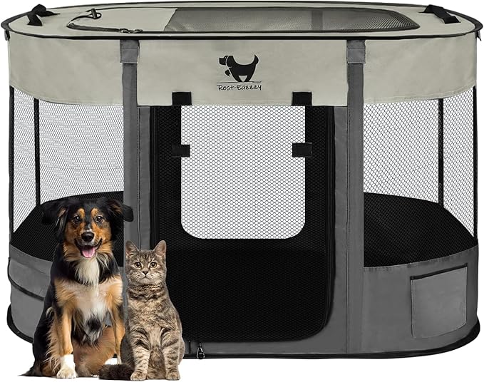 Rest-Eazzzy Dog Playpen, Foldable Kitten Playpen for Medium Dogs, Portable Pet Puppy Playpen with Removable Shade Cover, Indoor Outdoor Travel Camping Use for Small Pets with Carrying Case (M, Grey)
